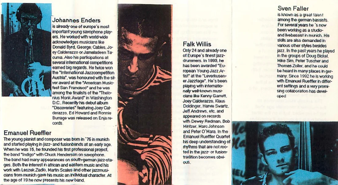 This tape of the Emanuel Rueffler Quartet contains a series of fine sounding personification codes: Four of talented instrumentalists, then one of a young formation that rather leaves the impression of a working band and last but not least the one of a promising composing talent and a skillful bandleader, both united in the person of Emanuel Rueffler. At the age of 19 he is the youngest of the band members, who are all in their twenties.